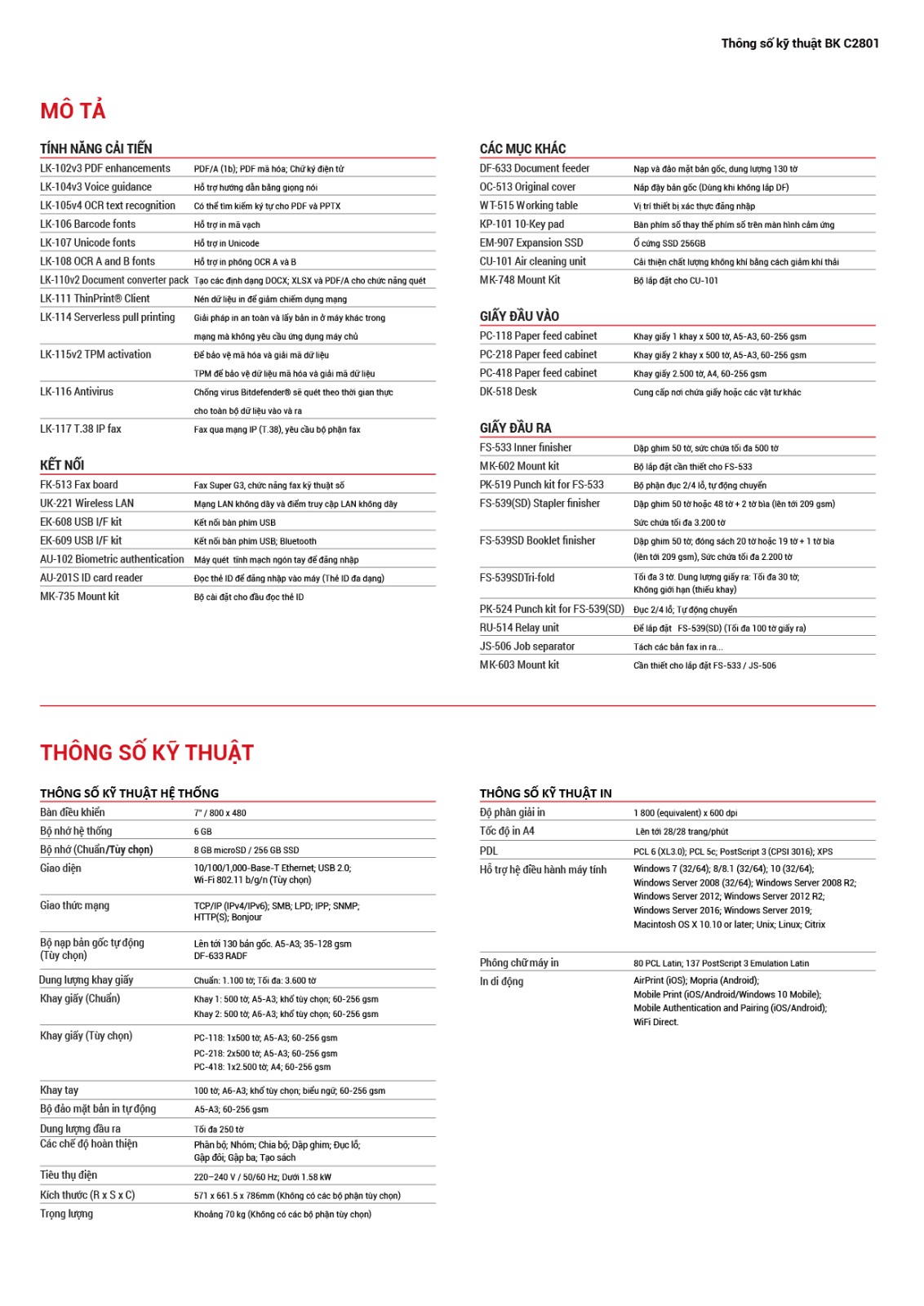 | Đặc điểm kỹ thuật thông thường | Mã mẫu | BK C2801 |