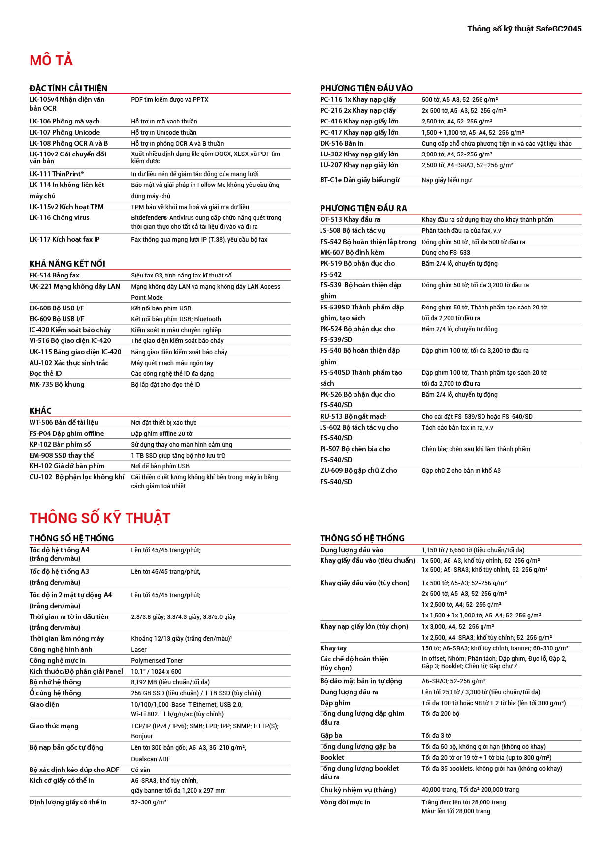 | Tốc độ in ra (A4 ngang) | Đen trắng: 45 trang/phút; Màu: 45 trang/phút | |