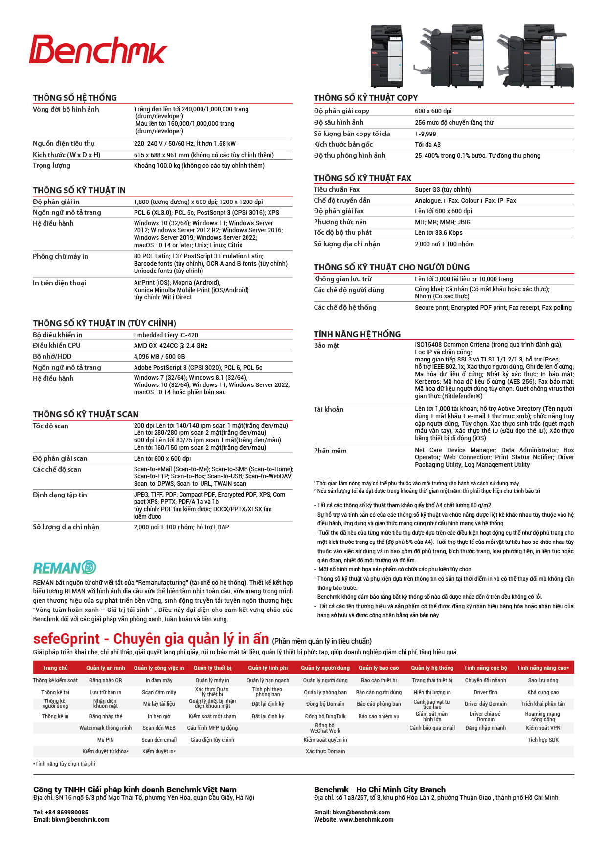 | Tốc độ scan | Một mặt (đen trắng/màu):140 trang/phút (tại 200dpi) Hai mặt (đen trắng/màu):280 trang/phút (tại 200dpi) | |